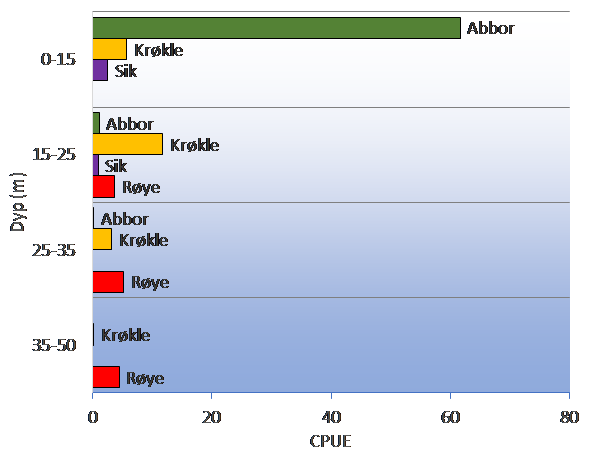 Fordeling i dypet av arter fanget i bunngarn i Norsjø i 2019. CPUE er antall fisk per 100 m2 garnareal per natt.
