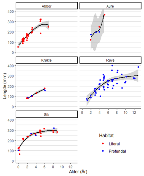 Individuell lengde ved alder hos fem arter fra Norsjø i 2019, og estimerte vekstkurver. Gråskravering gir 95 % konfidensintervall fo vekstkurven. Fargene angir fangstdyp (litoral=0-15 m, profundal=15-50 m)