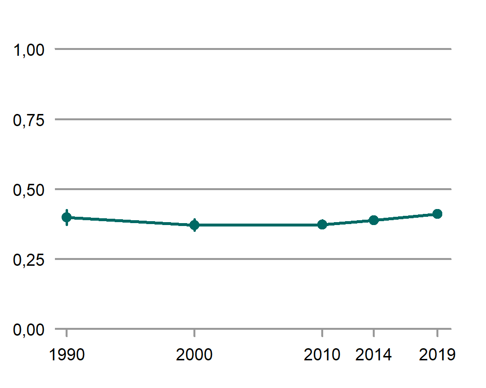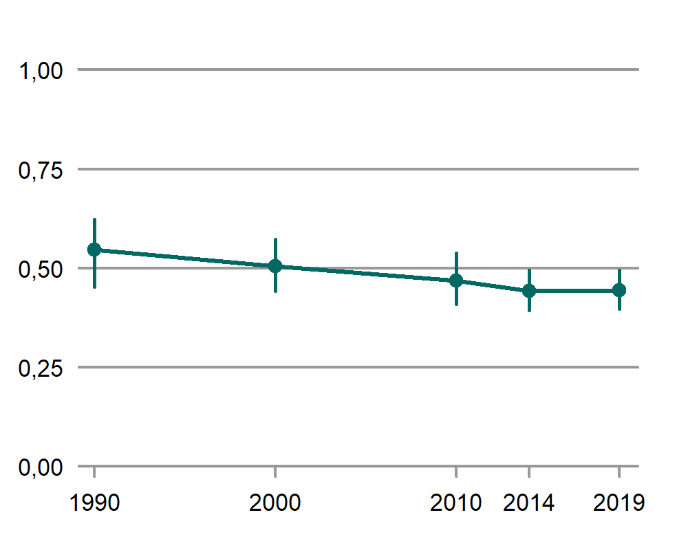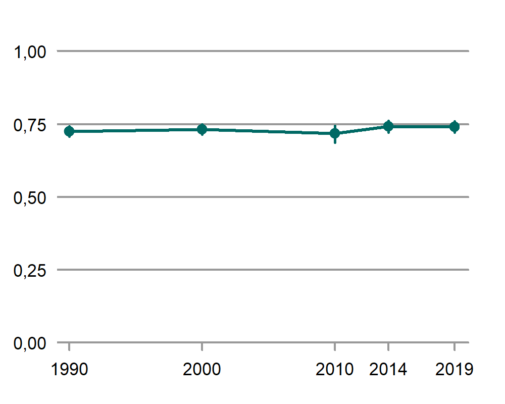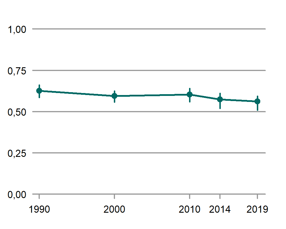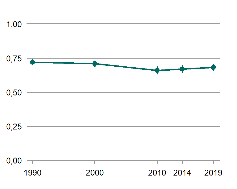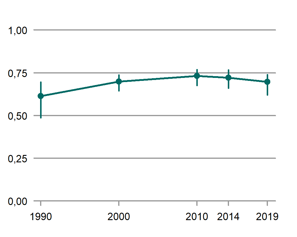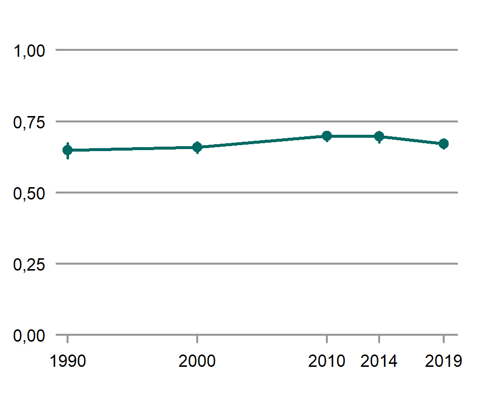 Naturindeks for våtmark har hatt en svak nedadgående utvikling fra 1990 til 2010, med en tilnærmet uendret verdi fra 2010 til 2019.
