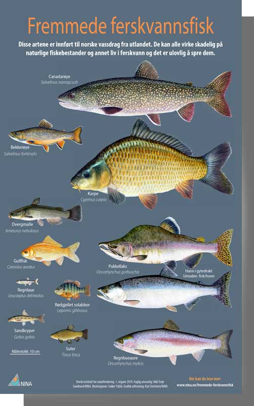 Her kan du lese mer om fremmede ferskvannsfisk - og også laste ned plakaten med tegninger av artene som er innført til norske vassdrag fra utlandet. De kan alle virke skadelig på naturlige fiskebestanderog annet liv i ferskvann, og det er ulovlig å spre dem.