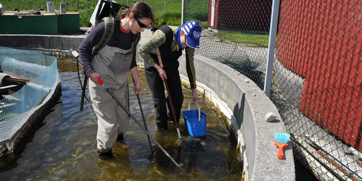 For å finne ut hvor mange yngel som har overlevd blir de fanget inn på slutten av forsøket, her av Grethe Robertsen (NINA) og Monica F. Solberg (HI). Forskerne bedøver yngelen med el-sjokk slik at de flyter opp og kan plukkes opp med en hov. Foto: Havforskningsinstituttet