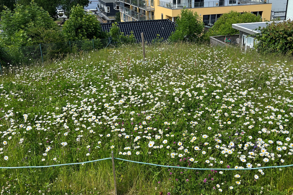 Naturrestaurering kan også øke naturmangfoldet i by. Her er gressplen omgjort til pollinatorvennlig blomstereng.