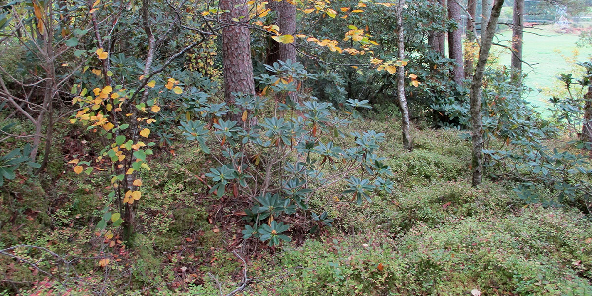 Nylig spiret forvillet Rhododendron ved gamle Todalsveien og rhododendronetablering under kraftlinje, Svinvik. Foto: Duncan Halley