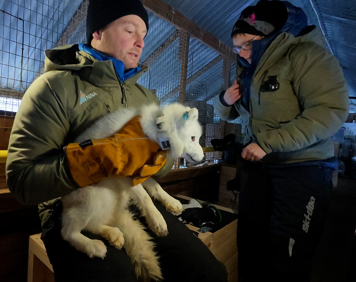 Fem av fjellrevene som ble sluppet fri var påført GPS-sendere for å kunne følge revene over grensa til Sverige og Finland. GPS-senderne er finansiert av Interreg Aurora gjennom prosjektet Felles Fjellrev. Foto: Kristine Ulvund & Craig Jackson / NINA