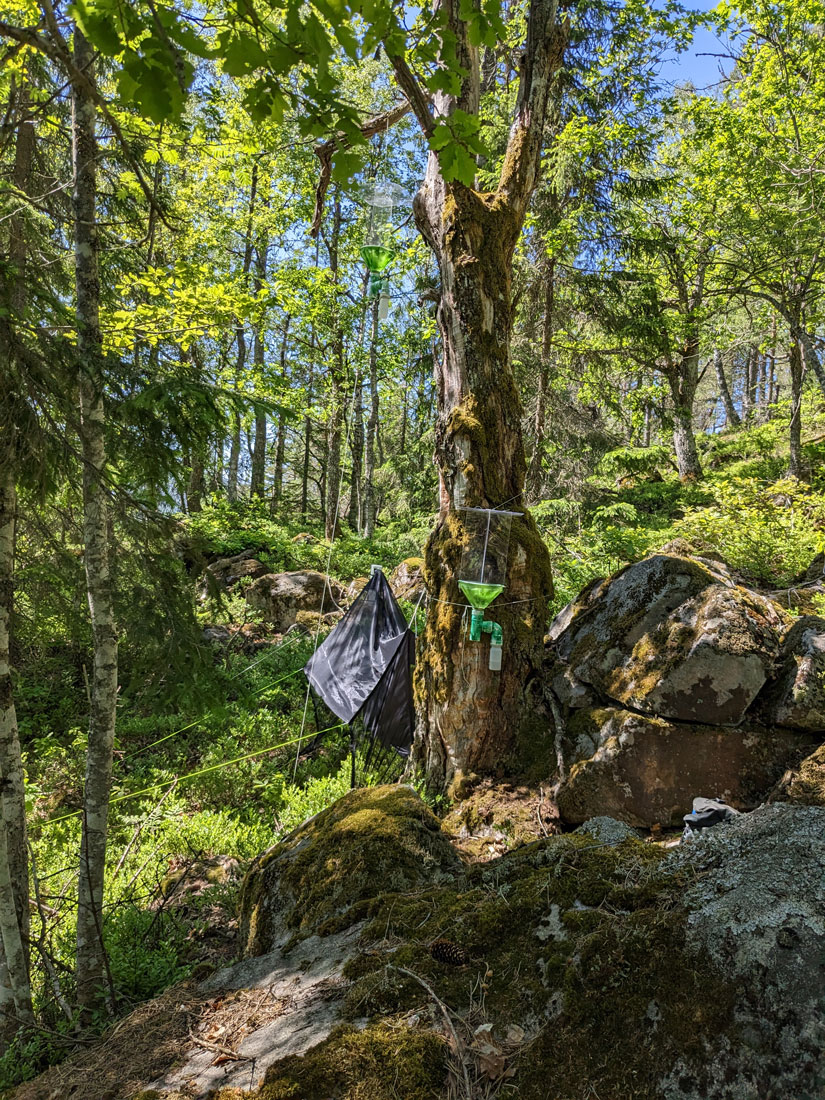 To typer insektfeller ble satt opp; vindusfeller som henger ved stammen og i kronen, og en malaisefelle som står ved siden av eika. Vindusfeller fanger særlig biller, mens malaisefeller fanger mer ulike typer veps, fluer og mygg. Foto: Ross Wetherbee