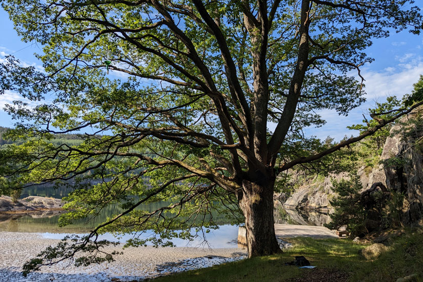 Forskere satte opp insektfeller ved denne majestetiske eika på Tåtøy utenfor Kragerø sommeren 2023. Foto: Ross Wetherbee