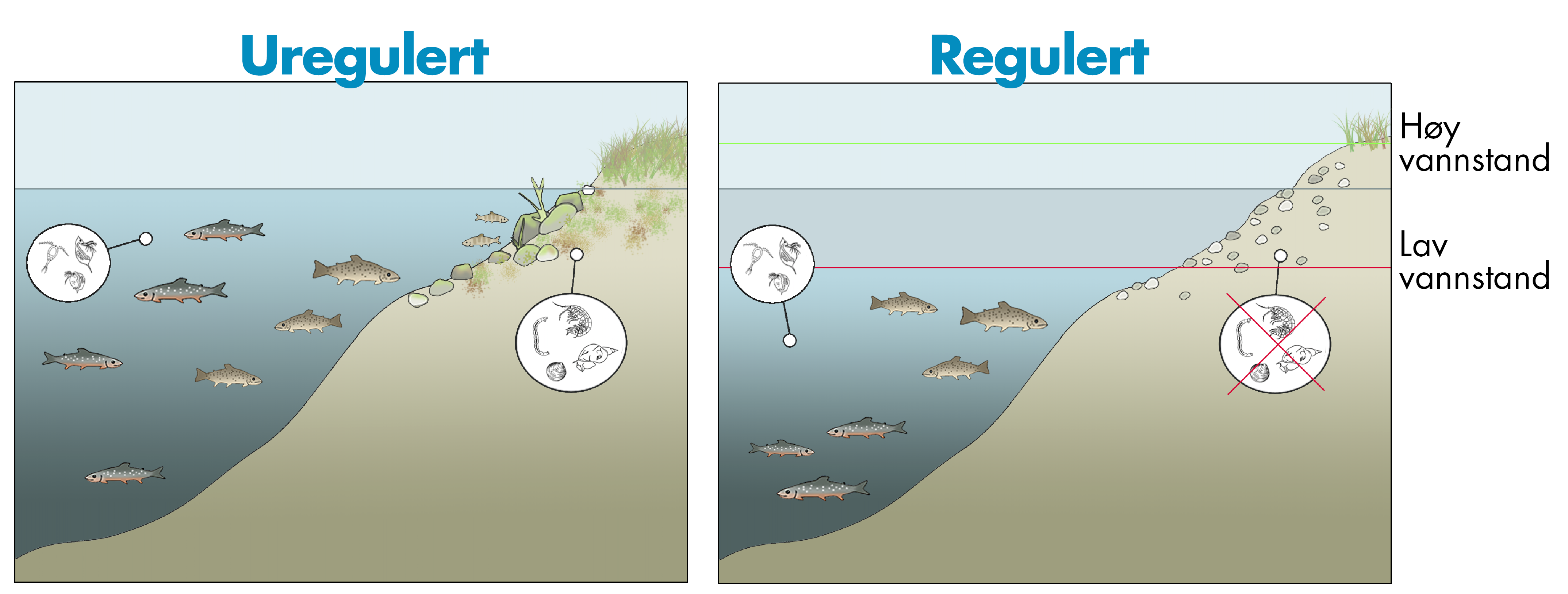 Vannstandsendringer fører ofte til erosjon, frysing og tørrlegging av strandsonen, som er et viktig leveområde for bade dyr og planter. Eloranta og kollegaene fant at røye flytter seg delvis vekk fra strandsonen i regulerte innsjøer, og heller finner mat ute i åpent vann, noe som igjen kan påvirke veksten og kvaliteten på fisken. Figur: Sigrid Skoglund/NINA.