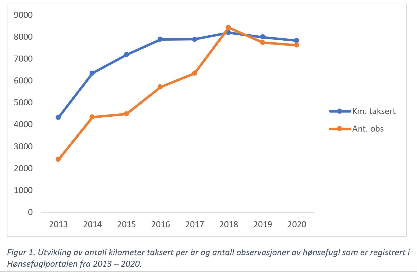 Hønsefuglportalen har vært under stadig utvikling siden lanseringen i 2013, og har med god hjelp fra Miljødirektoratet, Statskog, FeFo, Fjellstyresambandet og private rettighetshavere utviklet seg til å bli en nasjonal portal som dekker store deler av Norge. Takseringene i år har dekket hele 84 kommuner, hvor det er taksert nesten 8000 km. Utviklingen i omfang har vært positiv, og den har stabilisert seg de siste tre årene (Fig. 1).
