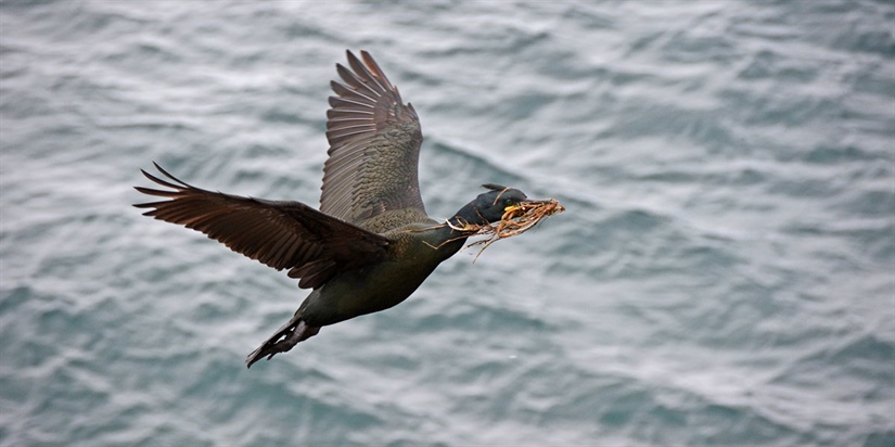 Forskerne fant klare sammenhenger mellom hekkesuksess, beiteadferd og valg av byttedyr hos toppskarv. Her er en toppskarv med reirmateriale i nebbet. Foto: Rob Barrett