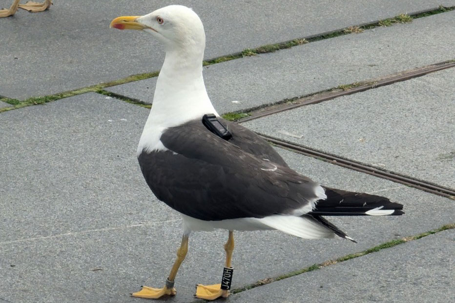 Sildemåke med GPS festet til ryggfjærene 35 dager etter deployering. Loggeren ble senere funnet etter at den hadde falt av fuglen. Foto © Sindre Molværsmyr