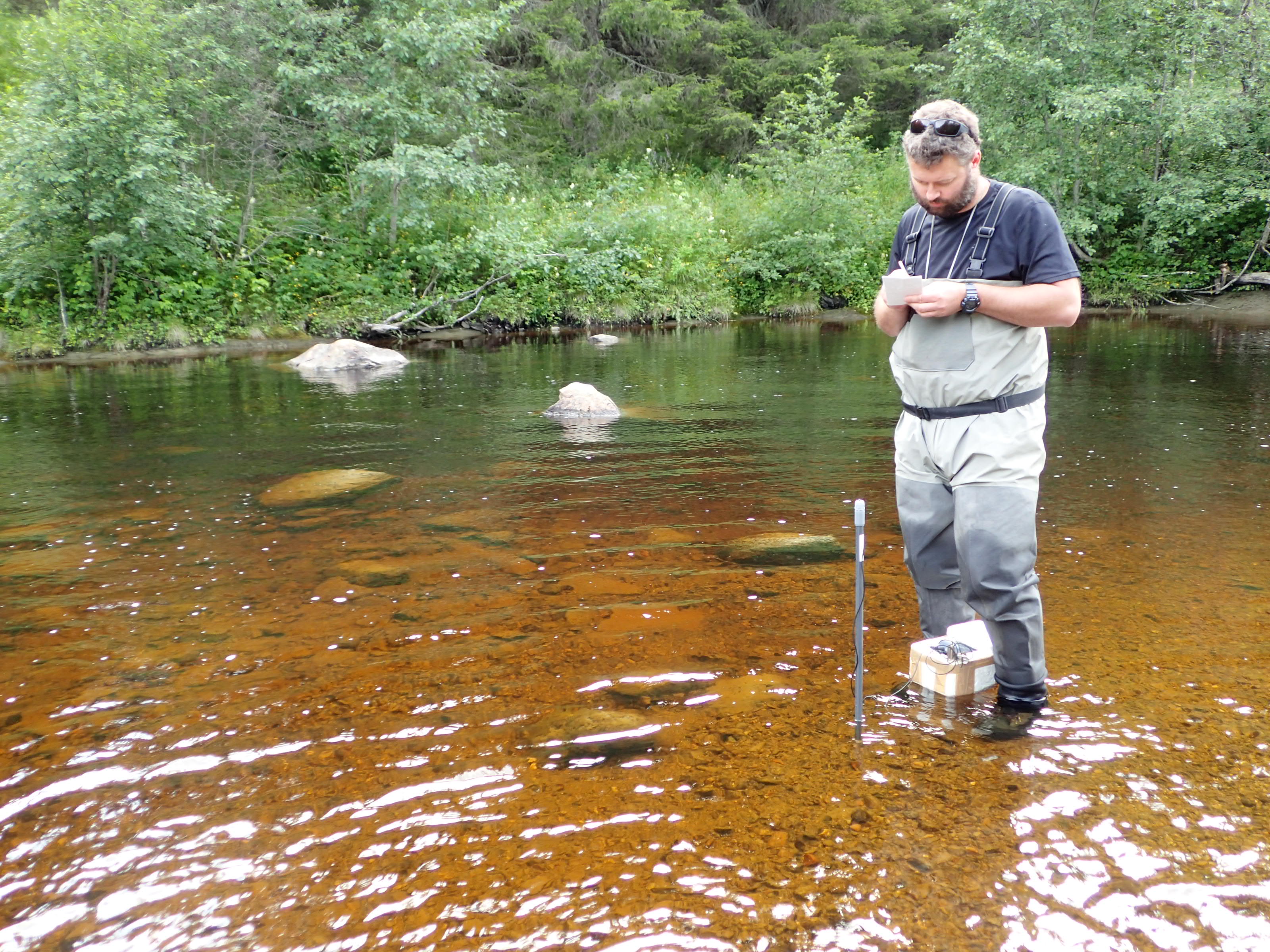 NINA-forsker Jon magerøy måler redokspotensialet i vassdraget. Det er et mål på oksygennivået, og på den måten kan han vise om redusert oksygentilgang i underlaget på elvebunnen kan være årsaken til at så få unge individer av elvemusling overlever, eller om det skyldes andre faktorer. Foto: Bjørn Mejdell Larsen, NINA