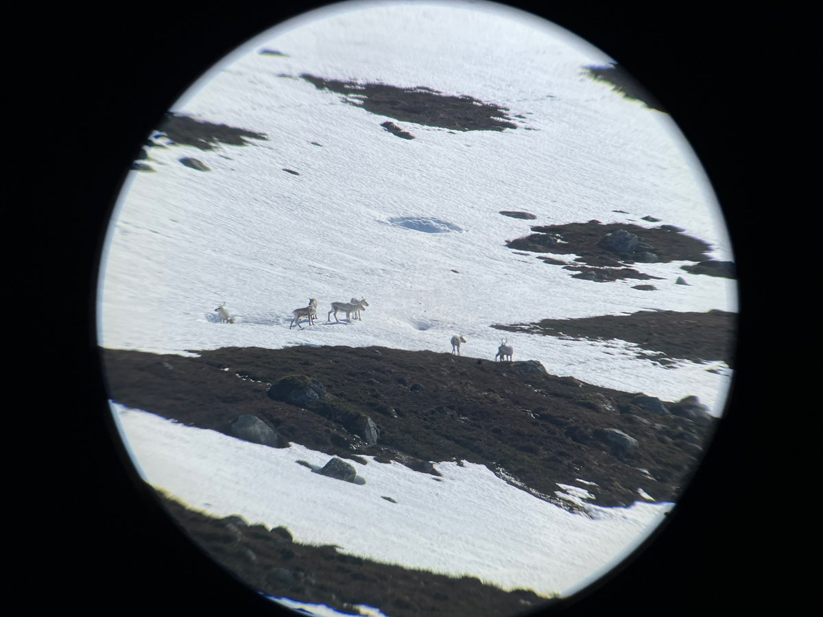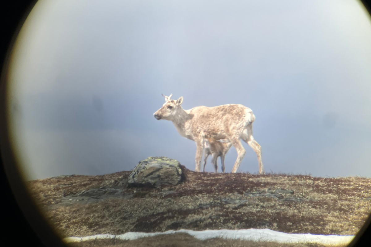 Filming av simler i kalvingstida skjer på langt hold gjennom teleskop, for å unngå forstyrrelser. Foto: Brage Bremset Hansen, NINA