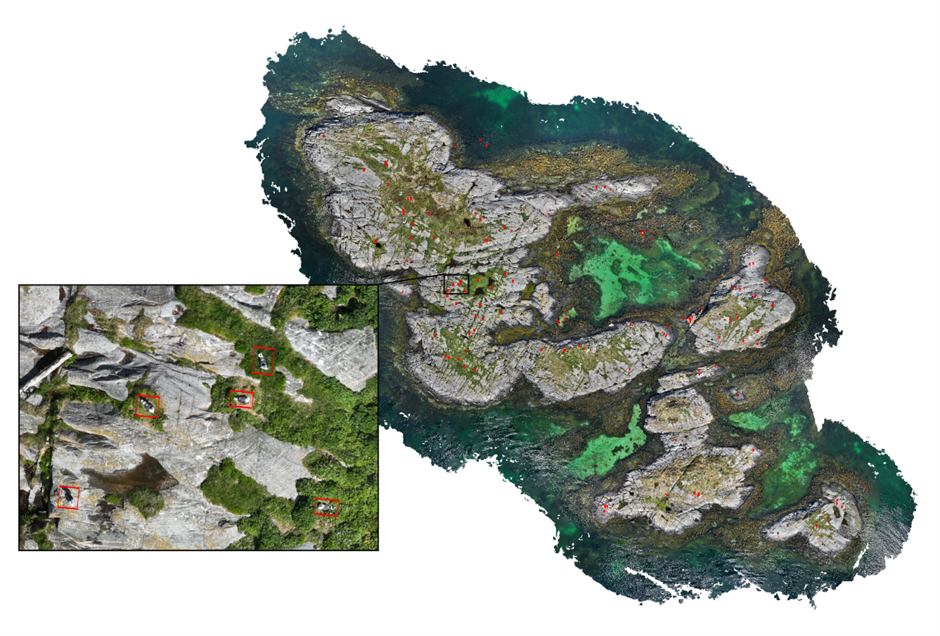 Orthomosaic of Småværsholman in Flatanger municipality, Trøndelag. Red boxes show what the model identified as seabirds. The inset shows four nesting great black-backed gulls (Larus marinus) and one standing on the ground. Illustration © Mie Prik Arnberg.