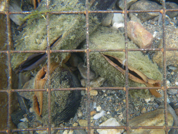 Noen få elvemuslinger ble satt i bur mens rotenonbehandlingen pågikk for å se hvordan de reagerte og om noen overlevde. Foto: Bjørn Mejdell Larsen / NINA.