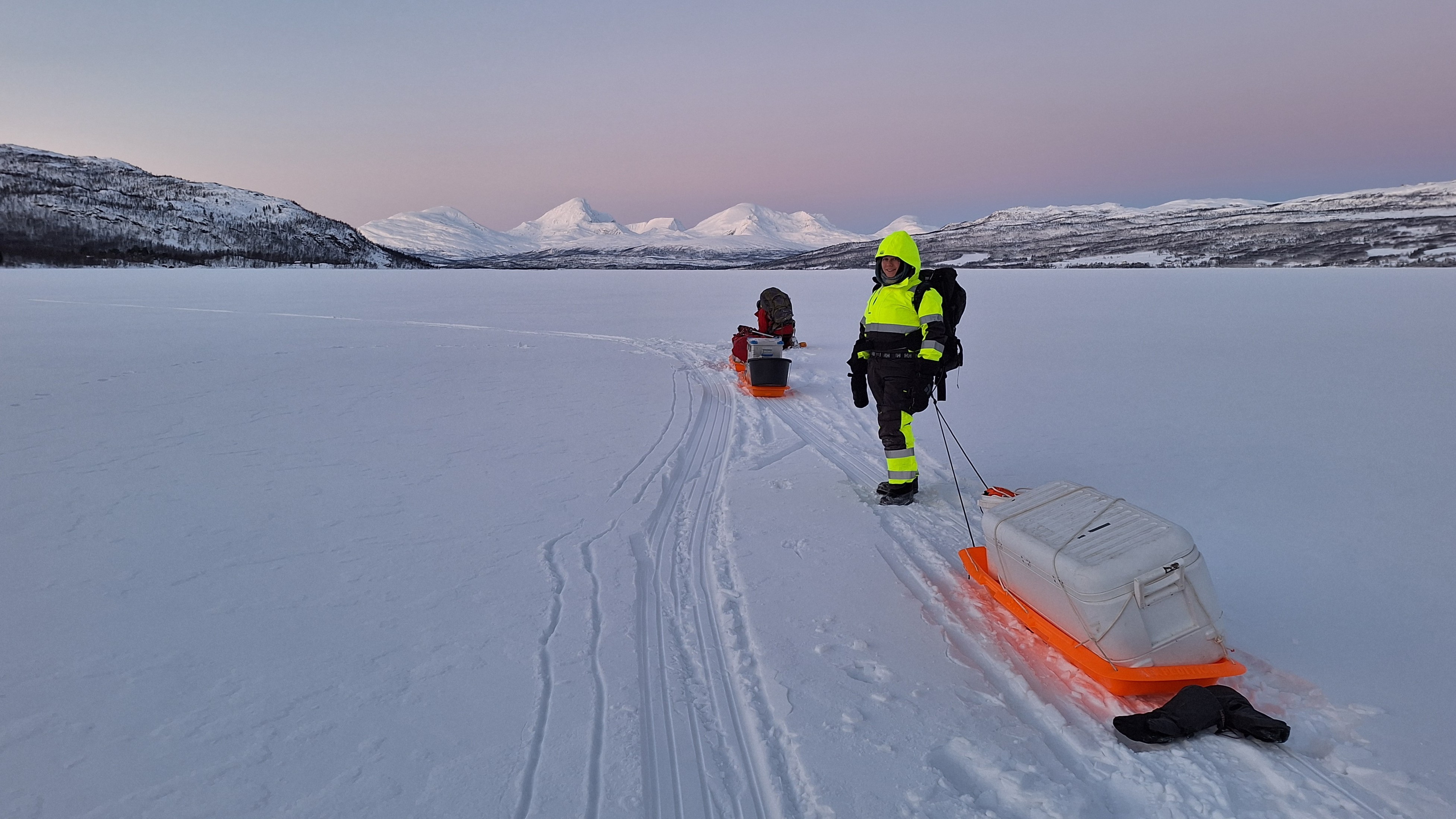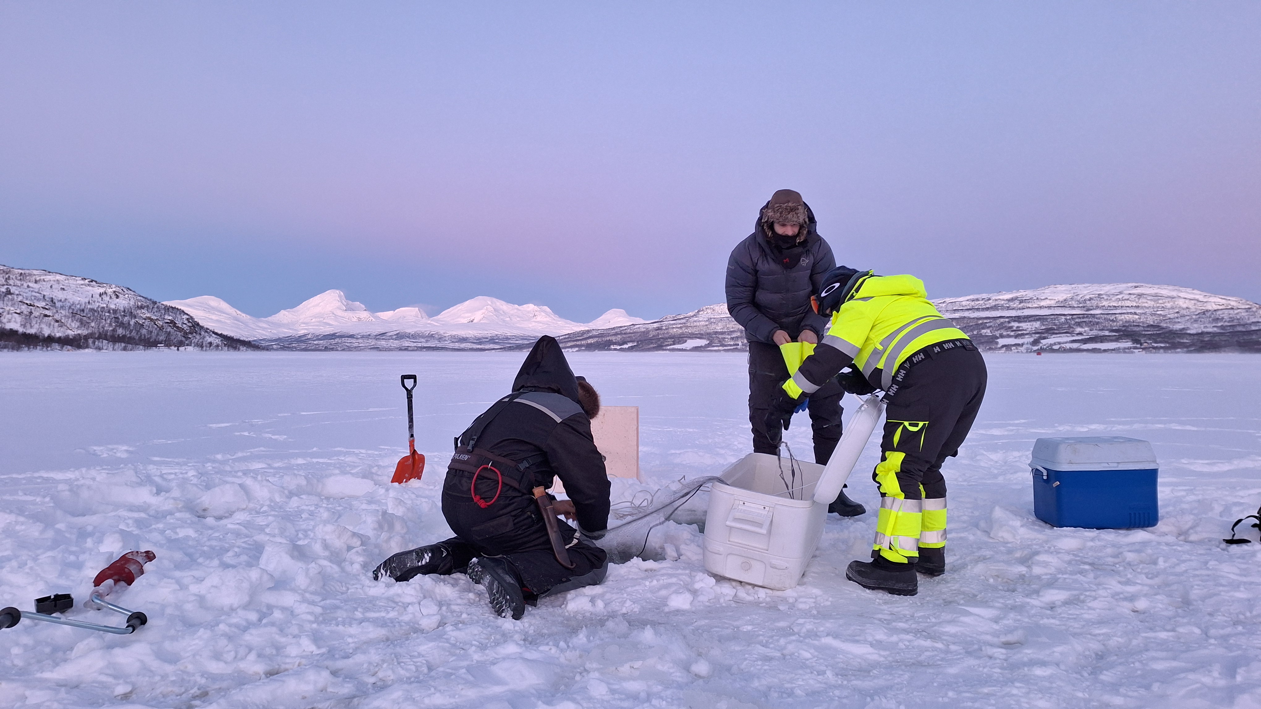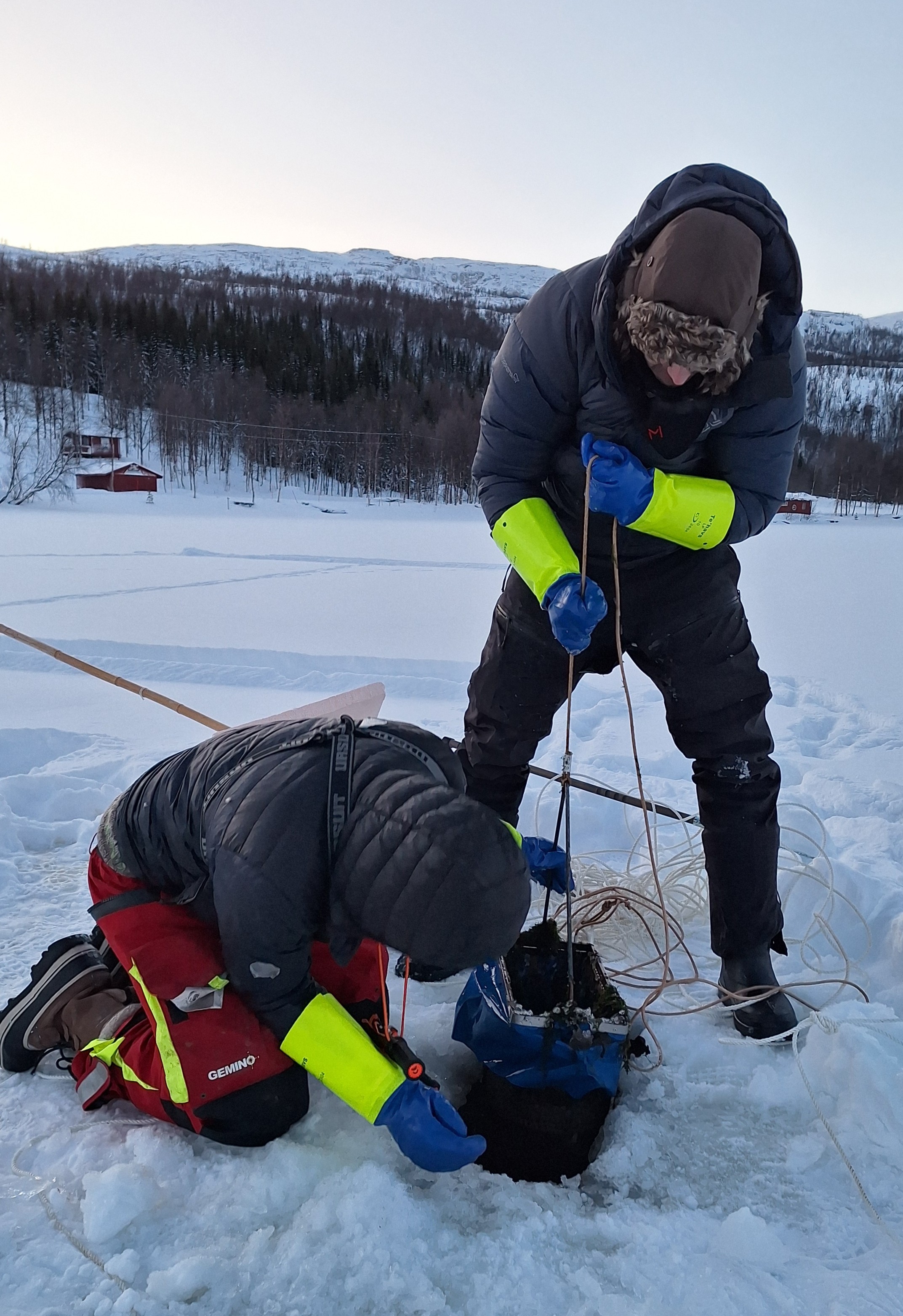 The project's main study location in Norway is Takvatnet, a large lake located 2 hours drive southeast of Tromsø city. Due to an extraordinarily mild autumn, the ice formation at Takvatnet that usually occurs during November, was very late this year. This delayed the first comprehensive after ice-on winter sampling campaign until early January. During four days at temperatures down to effective -30°C the team took samples of the entire food web from viruses to fish, including setting out fishing nets and collecting benthic samples from the coastal and deeper part of the lake. The ice thickness varied between 16 and 30+ cm – however, the low temperatures challenged sampling procedures and required careful planning and execution of the ambitious activities.
