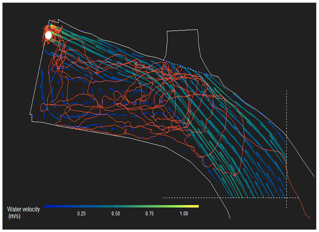 De blå linjene viser vannstrømmene, og de røde viser hvordan en av vinterstøingene svømte rundt i 22 timer før den fant veien ut etter at damluka var åpnet (ved hvit sirkel). I en naturlig elv ville den trolig svømt rett ut. Illustrasjon: Henrik Baktoft/DTU Aqua.