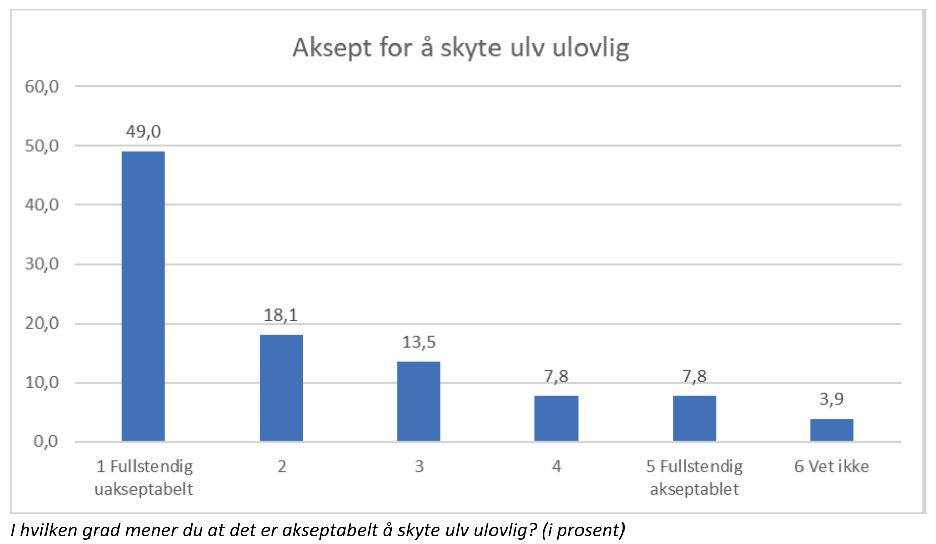 Hvis verdiene 1 og 2 er uttrykk for oppfatningen om at ulovlig avliving av ulv er uakseptabelt, ser vi at et klart flertall (67 prosent) slutter seg til dette synet. Ser vi svaralternativene 4 og 5 som uttrykk for aksept, aksepterer 16 prosent i større eller mindre grad at ulv skytes ulovlig. Relativt få finner handlingen fullstendig akseptabel, men det er en betydelig gruppe som har svart mellom de to ytterpunktene. En mulig tolkning er at disse mener det avhenger av situasjonen lovbruddet skjer i om det er akseptabelt eller ikke.