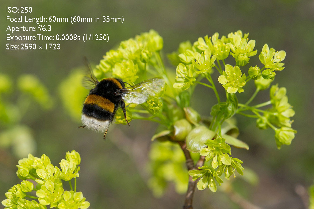 Bruk raske lukkertider (1/500 sekund og raskere) og middels stor blenderåpning hvis lysforholdene tillater det. Da får du gjerne humlekroppen skarp, mens vingene gir flotte bevegelsesmønstre. Et tips for å få raskere lukkertider er å skru opp ISO-verdien.