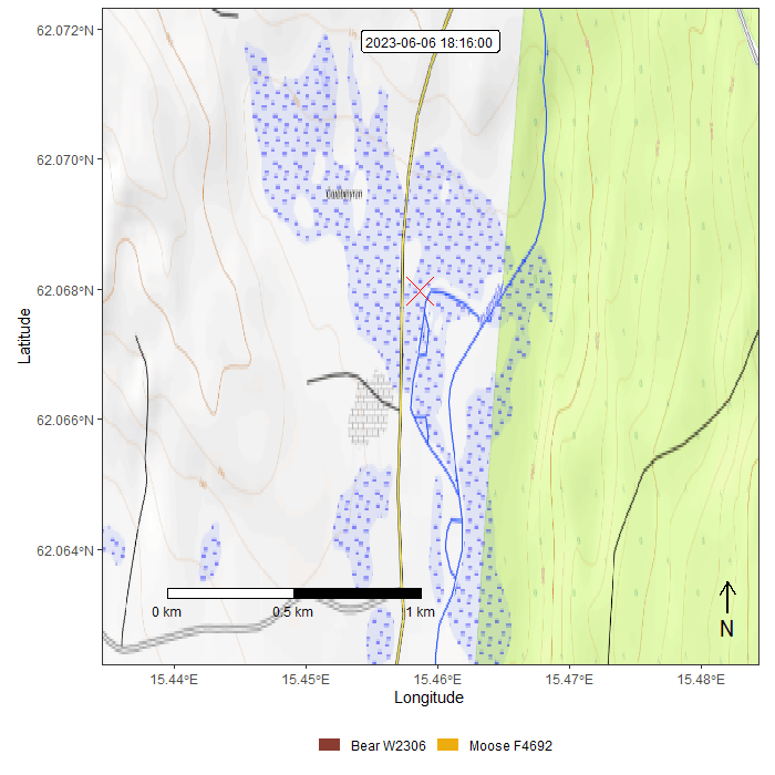 6. juni 2023 ble sensorene på en voksen elgku og en voksen hannbjørn utløst da dyrene kom nært hverandre og halsbåndene begynte å samle GPS-data hyppigere. Elgen samlet posisjoner hvert 2. minutt over 89 minutter og bjørnen hvert minutt over 41 minutter. Tidsperioden er avgrenset fordi det krever mye strøm fra batteriet å sende GPS-posisjoner ofte.