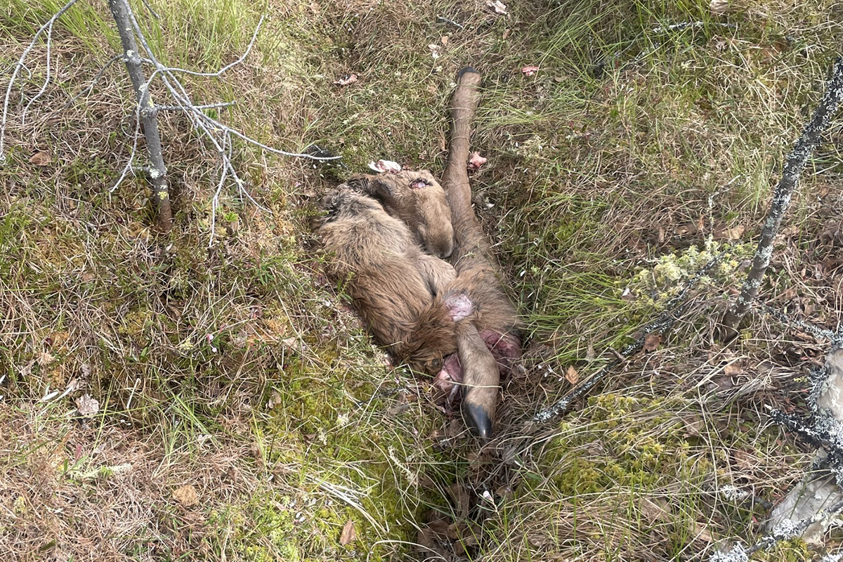 Elgkalven ble funnet med bittmerker fra bjørn på hodet og nakken. Over halvparten av kalven var spist opp. Foto: Jenny Mattisson