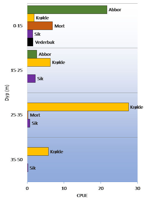 Fordeling i dypet av arter fanget i bunngarn i Eikeren i 2019. CPUE er antall fisk per 100 m2 garnareal per natt.