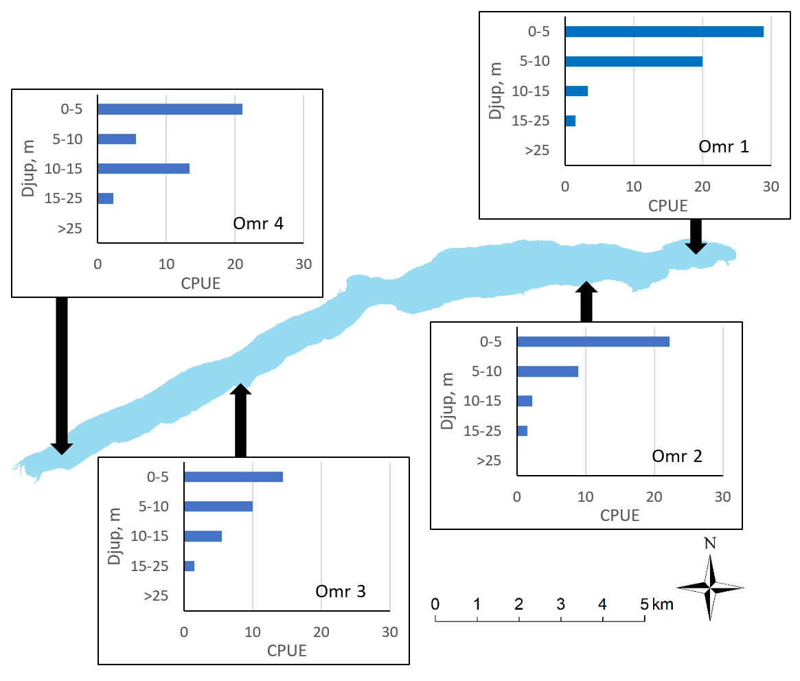 Fangst av aure i ulike dyp i de fire områdene som ble fisket med bunngarn i Gjende i 2019. CPUE er antall fisk per 100 m2 garnareal per natt.