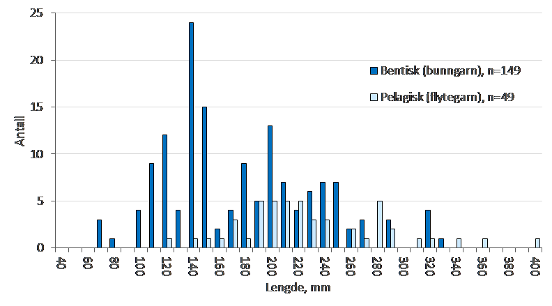 Lengdefordeling hos aure fanget i Gjende i 2019. n er antall fisk.