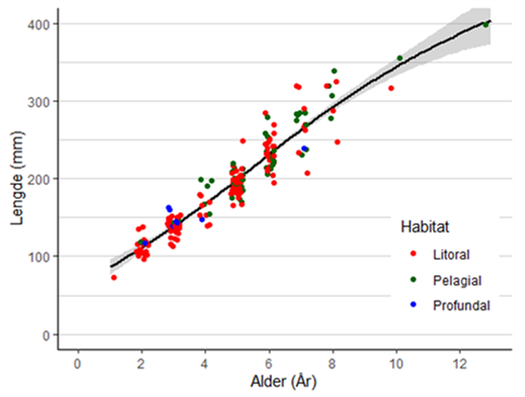 Individuell lengde ved alder hos aure i Gjende i 2019, og estimerte vekstkurver. Skravering gir 95& konfidens-intervall for vekstkurven.