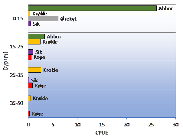 Prøvefiske med bunngarn og trål i 2019 fanget seks av artene. Abbor var do-minerende art i bunngarnfangstene i alle de seks områdene som ble fisket. Totalt utgjorde abbor 71 % av fangsten. Andre arter som ble fanget var ørekyt (15 %), krøkle (9 %), sik (3 %) og røye (2 %), samt ett individ av gjedde. Abbor var den mest tallrike arten både på 0-15 og 15-25 m dyp, men hadde absolutt høyest tetthet i litoralsona (0-15 m). Ørekyt ble bare fanget i litoralsona. Krøkle fordelte seg på alle dyp i bunngarnfangstene, med høyest tetthet mellom 15 og 35 m. Sik ble fanget på alle dyp<35 m, og røye på alle dyp>15 m.