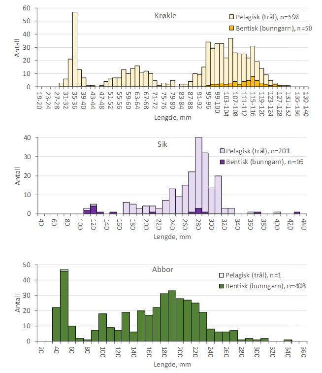 Lengdefordeling hos krøkle, sik og abbor fanget i bunngarn og trål i Randsfjorden i 2019. Bare et utvalg av trålfangsten av krøkle ble lengdemålt. n er antall fisk.