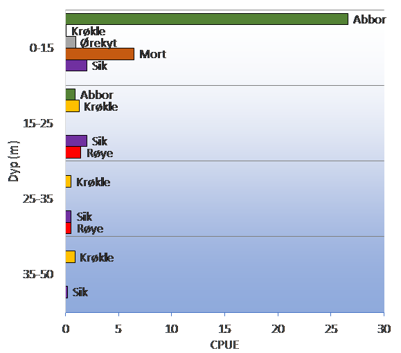 Fordeling i dypet av arter fanget i bunngarn i Tyrifjorden i 2019. CPUE er antall fisk per 100 m2 garnareal per natt.
