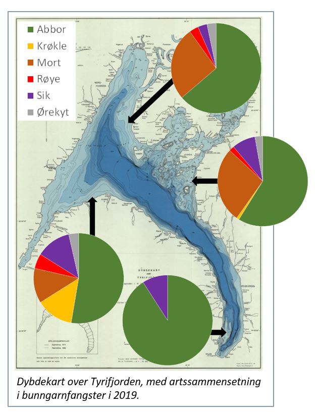 Dybdekart over Tyrifjorden med artssammensetning i bunngarnfangster i 2019.